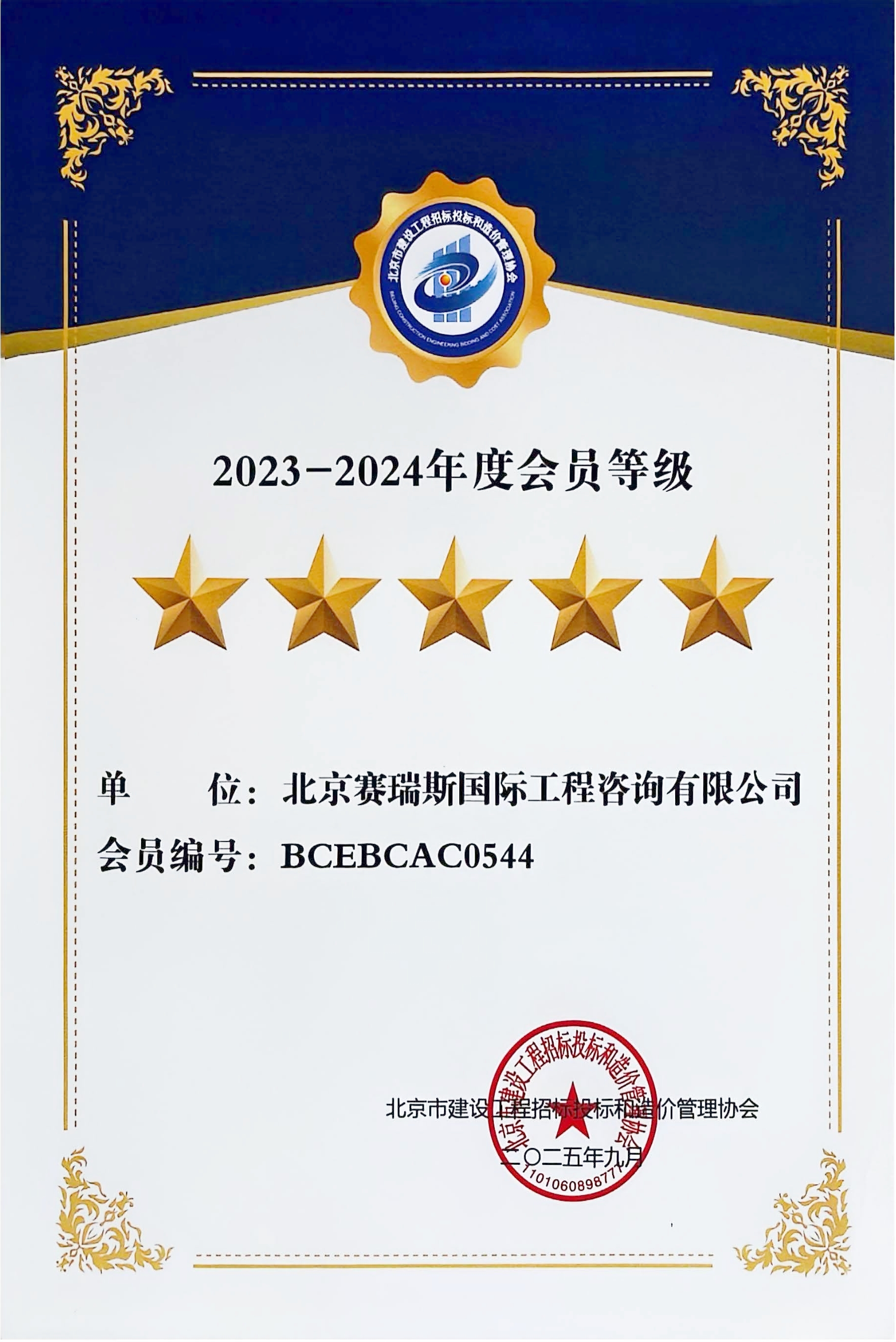 近期,北京市建设工程招标投标和造价管理协会(京标价协)正式公布了2023-2024年度星级会员及会员之星评价结果。经过严格的评审与多维度考核,中冶京诚赛瑞斯凭借卓越的专业服务能力、规范的行业行为以及良好的社会信誉,在众多会员单位中脱颖而出,成功获评最高级别的“五星级会员单位”。这一荣誉不仅是对我们过去工作的充分肯定,更是对我司综合实力与行业贡献的高度认可。
