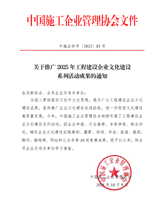 为展示广大工程建设企业文化建设成果,宣传推广企业文化建设的先进经验,进一步促进文化赋能企业高质量发展,中国施工企业管理协会举办2025年度工程建设企业文化建设系列活动。近日,活动公布结果,中冶京诚赛瑞斯一举斩获网站竞赛成果一等奖、期刊竞赛成果二等奖、公众号竞赛成果二等奖三项殊荣。