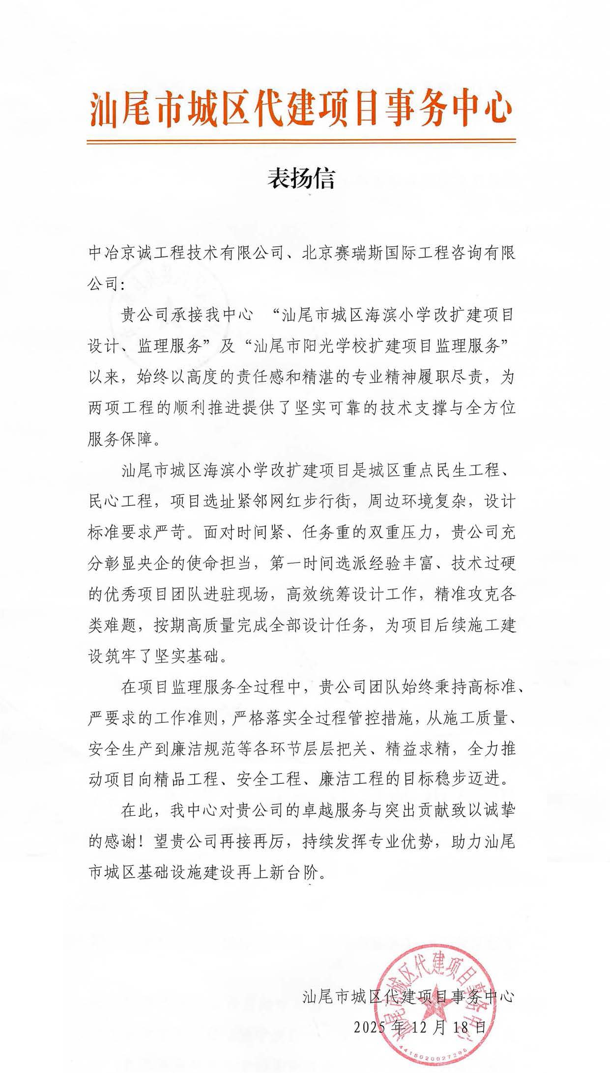 表扬信是对公司专业能力与服务水平的高度认可,同时也为后续在当地业务拓展注入强劲动力。下一步,赛瑞斯将以此为契机,进一步强化责任意识、细化工作举措、提升服务效能,全力以赴推进项目后续建设工作。同时,始终聚焦教育基建领域需求,以更高标准、更优服务助力完善汕尾市教育基础设施体系,为推动区域教育事业高质量发展贡献更大力量。