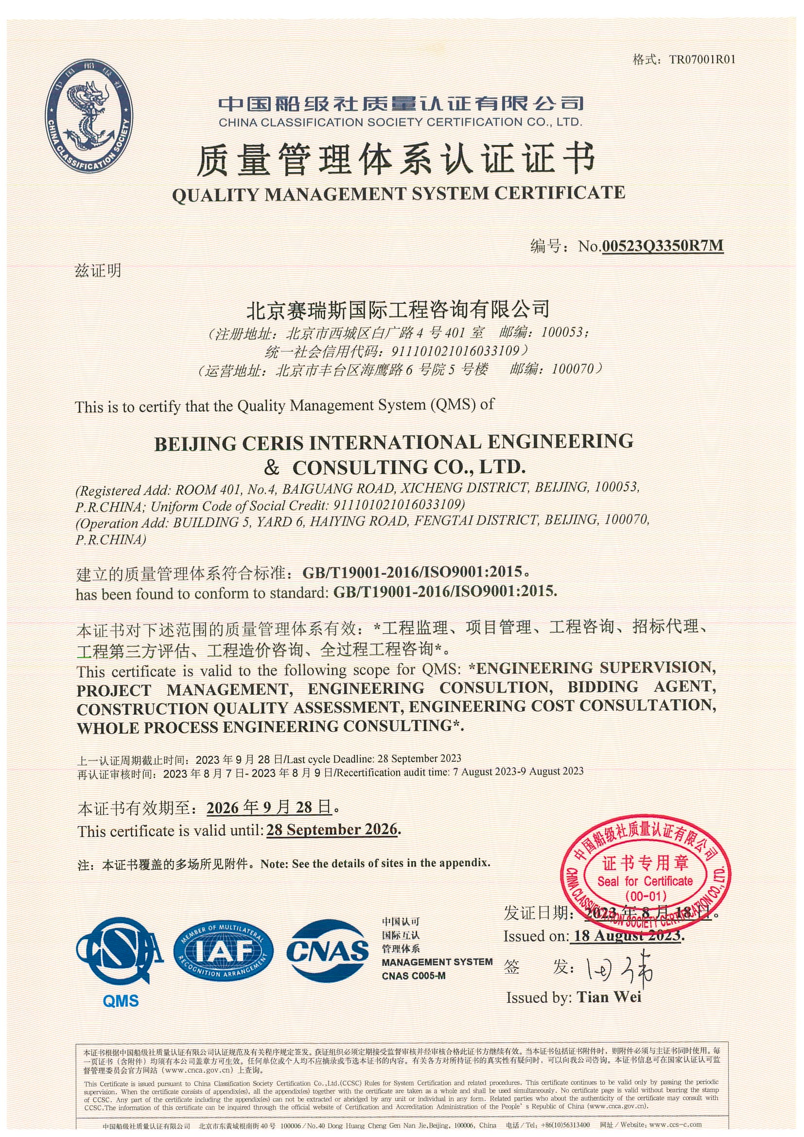 质量管理体系认证证书