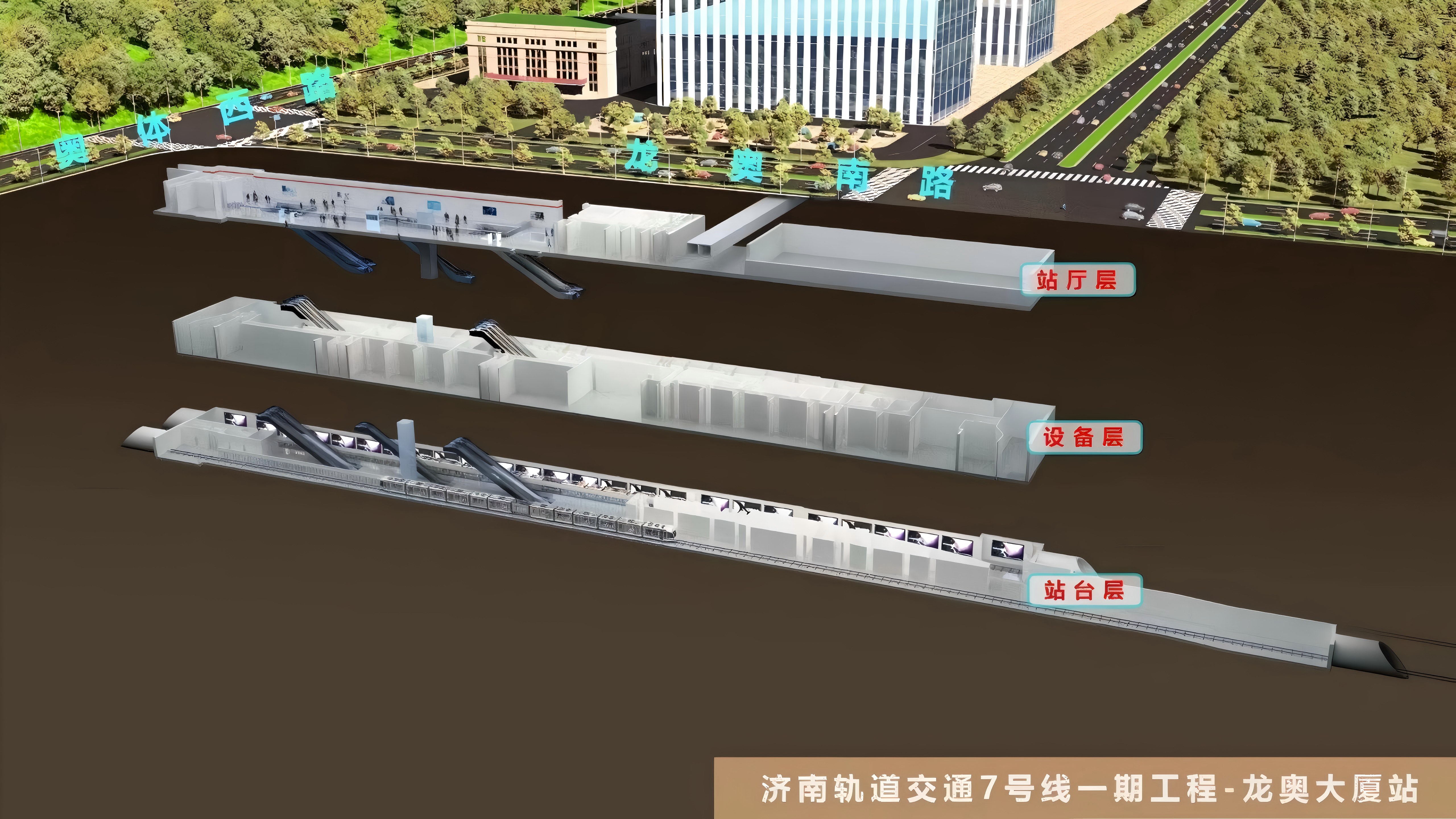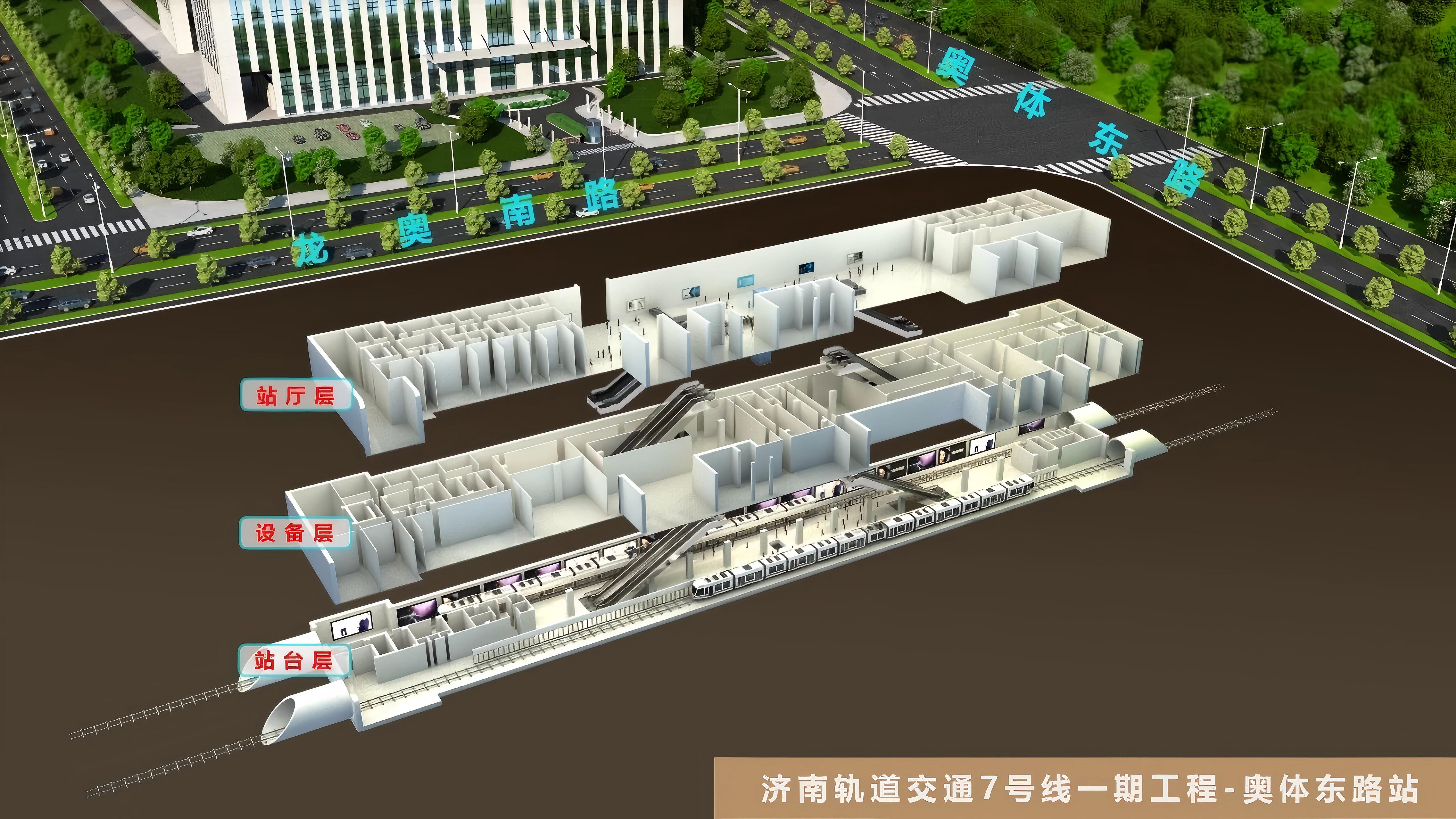 龙奥大厦站位于奥体西路与龙奥南路交叉口东侧,是7号线与3号线的换乘站,车站为地下三层岛式车站。该站地处济南市核心区域,周边建筑密集,交通繁忙,施工环境复杂,对监理工作提出了极高要求。