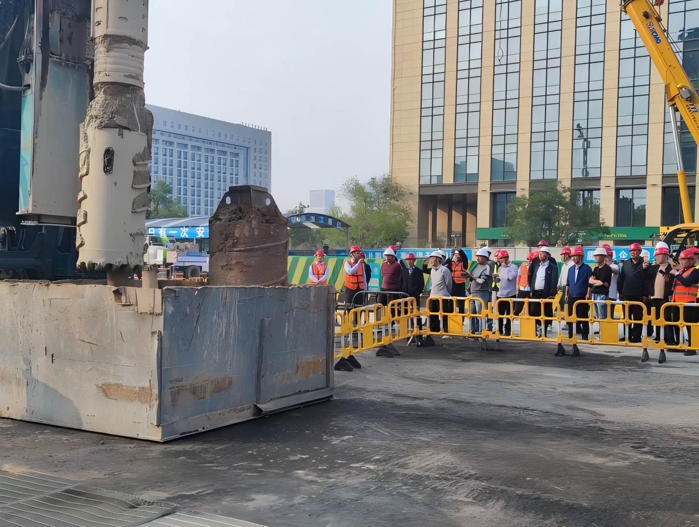 自制被动取土器:龙奥大厦站采用自制被动取土器,辅助旋挖钻机钻头卸渣,大幅减少甩土过程中土体与筒体的粘黏,有效减少噪声值和甩土次数,实现防尘降噪效果,打造环境友好型工地。