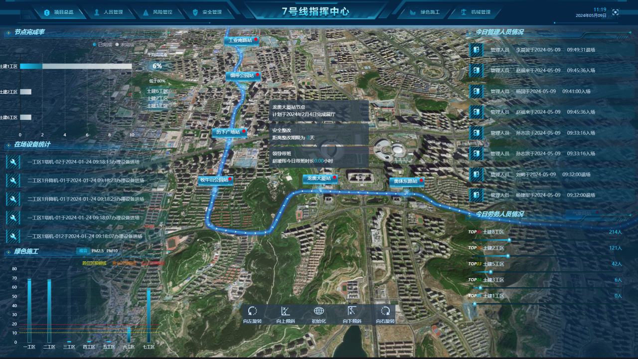 智能监控系统:项目建立了智慧展厅,全天候智能监控平台,对周边建筑物沉降、施工环境等进行实时监测,实现了"无死角"管理。辅助应用智慧安全帽,集摄像头、远程通话、碰撞检测、脱帽检测、SOS及照明等功能于一体。后台指挥人员发现安全问题,能及时通过在线调度平台及智慧安全帽连线,告知管理人员迅速排查整治,有效避免安全隐患的发生。